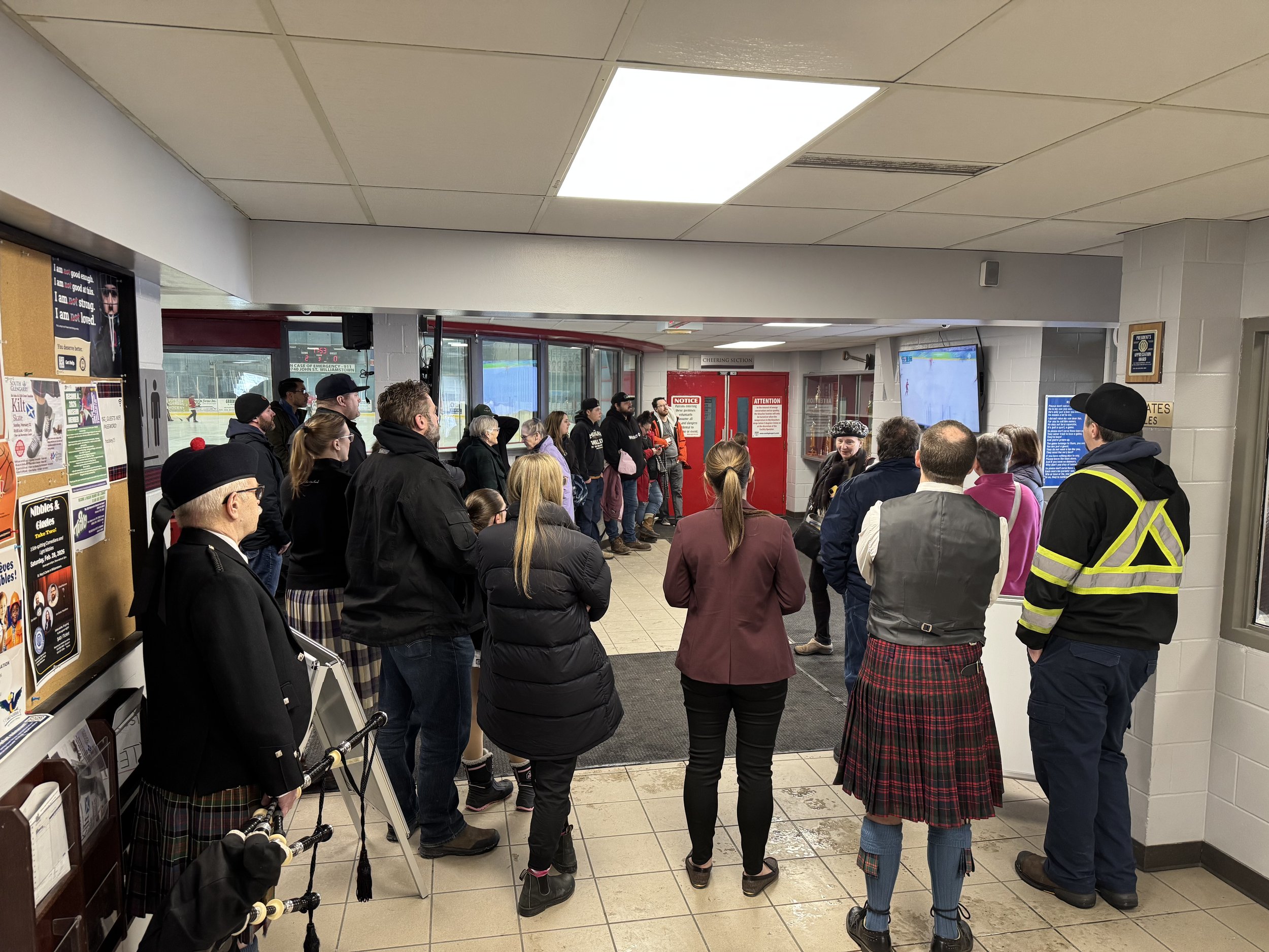 This year the kilt skate had to contend with competition from a different quarter far away in Italy. On that Sunday afternoon, Canada and USA faced off for the men’s Gold Medal hockey match-up on the final day of the Milano-Cortina Winter Games. The organizers responded by providing a television in lowhich proved very popular.