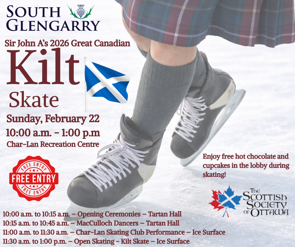 /The Township of South Glengarry has a strong tradition of combining the Great Canadian Kilt Skate with other elements that turn a kilt skate into a winter fair. As usual, the festivities included free skating at the Char-Lan Recreation Centre in Williamstown. Add to that: free hot chocolate and cupcakes.