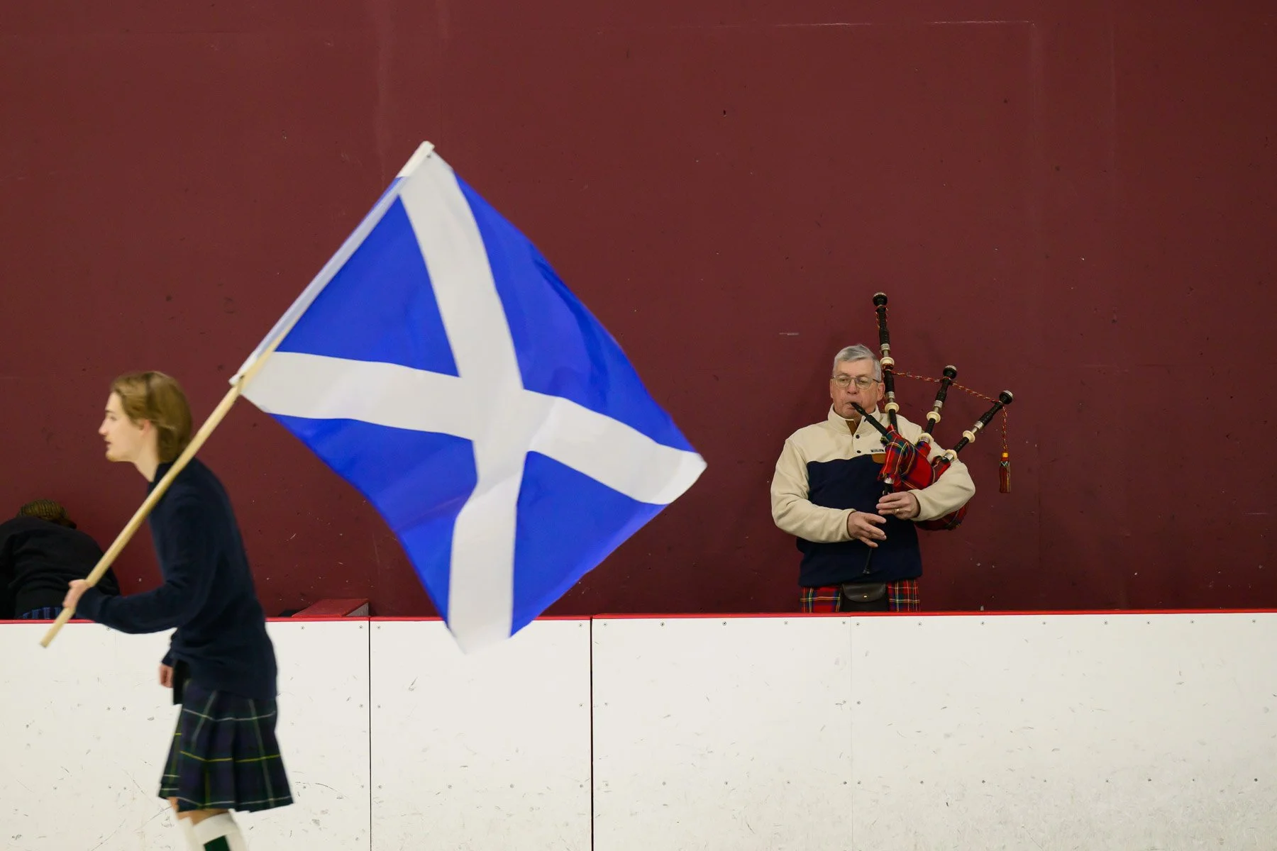 The skaters circled the rink to the skirl of the bagpipes.