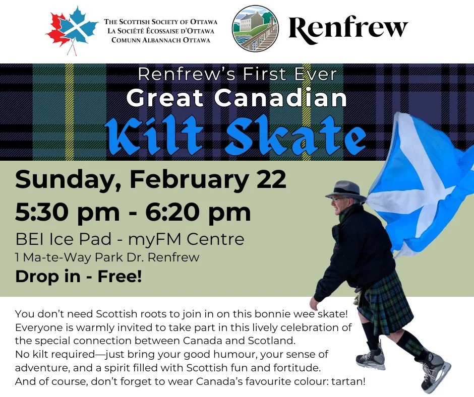 Indoors or outdoors. Canada, Scotland, or USA. Burns weekend, Family Day weekend, or the International Kilt Skate weekend. This kilt skate season has been one of the best years yet for the Great Canadian Kilt Skate. A total of 15 communities hosted events in 2026 — the largest number yet. Ten of those skates were held on the weekend of February 21-22l The media coverage for the events was excellent in various cities, In many communities the kilt skate has taken its place among the winter festivals that provide winter fun for so many.